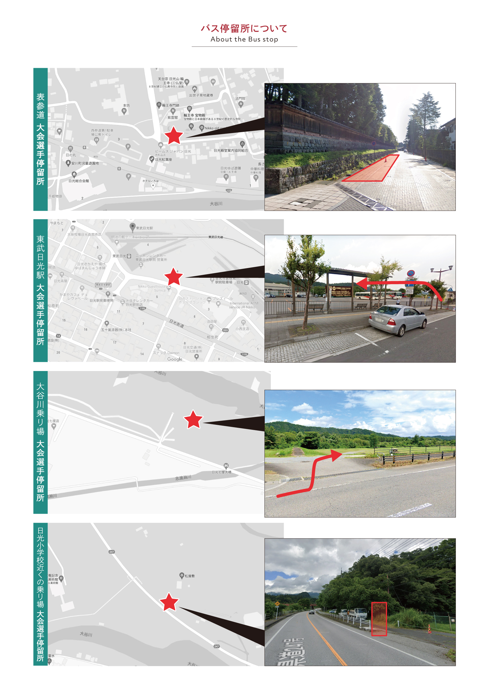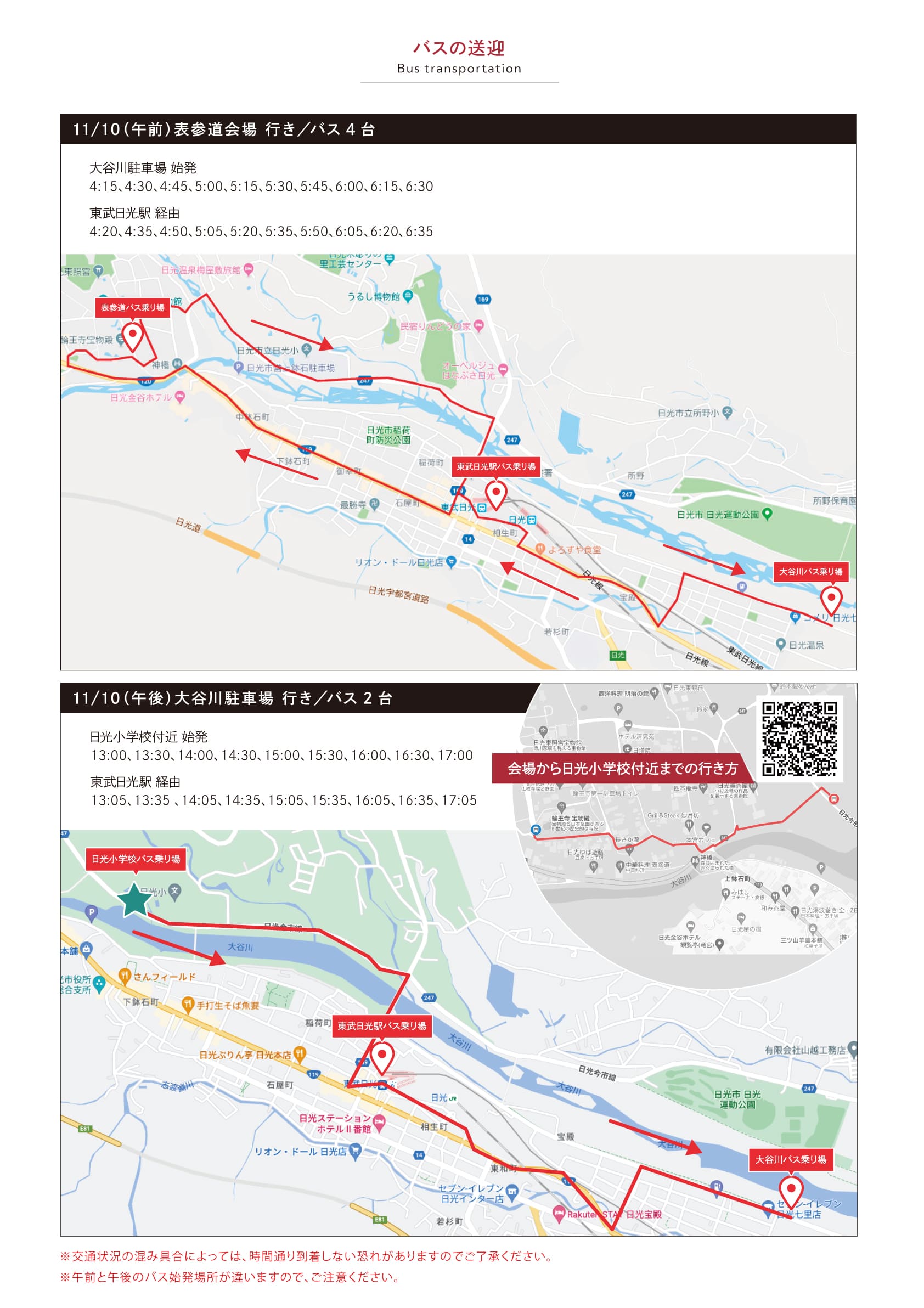 なお、当日は紅葉のシーズンで大変混雑が予想されます。帰りのバスは会場停車ではなく、日光小学校付近より発着しますので事前にルートを確認お願いします。